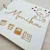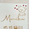 Predná doska albumu je ozdobená vygravírovaným motívom macíka, ktorý dodáva albumu hravý a roztomilý vzhľad. Tento motív symbolizuje jemnosť a nežnosť spojenú s detským obdobím. Okrem toho je album personalizovateľný, takže môžete zaslať meno vášho bábätka, dátum a čas narodenia, výšku a váhu pri narodení, a my ho vygravírujeme na prednú dosku. Tento detail pridáva albumu osobitosť a robí ho skutočne nezabudnuteľným darčekom.
