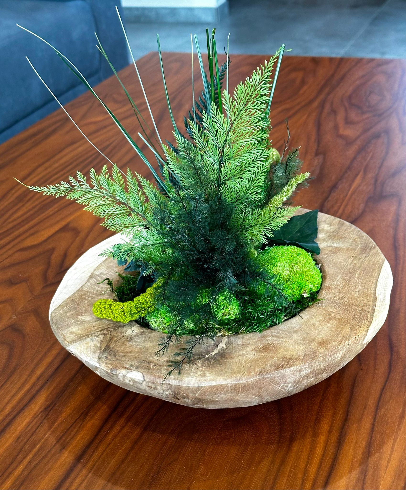 Teaková miska v kombinácií so stabilizovaným machom, rastlinami a kvetmi.