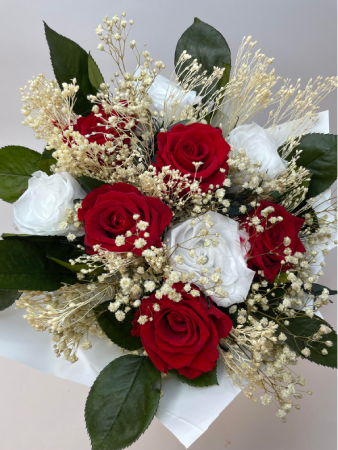 Hľadáš dar, ktorý spája eleganciu, nadčasovosť a zároveň aj praktickú trvácnosť? Kytica Ravea ti prináša všetky tieto hodnoty v jednom jedinečnom celku. Kombinuje červené a biele stabilizované ruže, ktoré vytvárajú klasickú súhru farieb. Túto noblesnú dvojicu dopĺňajú aj ďalšie stabilizované prvky, vďaka čomu pôsobí celá kompozícia harmonicky, no zároveň zanecháva silný vizuálny dojem. Každý kvet v kytici starostlivo aranžujeme ručne, takže výsledok vždy pôsobí jedinečne a s osobným dotykom.