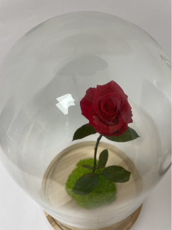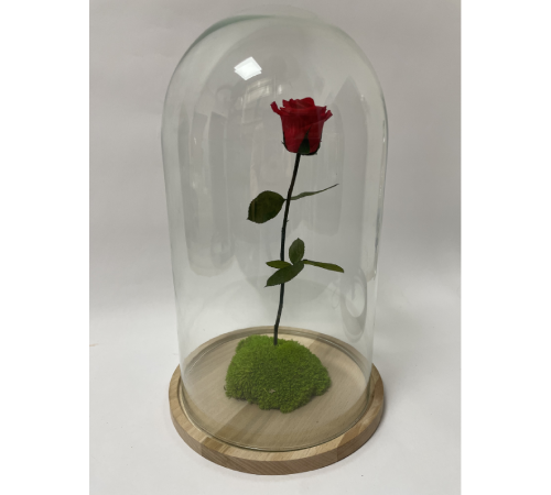 V srdci kopule sa nachádza jediná červená ruža – ručne aranžovaná a stabilizovaná tak, aby si zachovala svoju prirodzenú krásu a sviežosť niekoľko rokov. Jemný zelený mach na drevenej podložke dodáva celej kompozícii kontrast a vytvára dojem malého ostrovčeka života. Vďaka tomu pôsobí ruža ešte výraznejšie a podčiarkuje svoj jedinečný charakter.