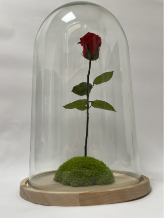 - Sklenený zvon, drevená podložka, stabilizovaná ruža a stabilizovaný mach
